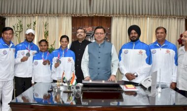 मुख्यमंत्री श्री पुष्कर सिंह धामी से बुधवार को मुख्यमंत्री आवास स्थित कैम्प कार्यालय में गुजरात में आयोजित 36वें नेशनल गेम्स के एथलेटिक्स प्रतिस्पर्धा में मेडल प्राप्त करने वाले एथलेटिक्स एवं उनके प्रशिक्षकों को सम्मानित किया।